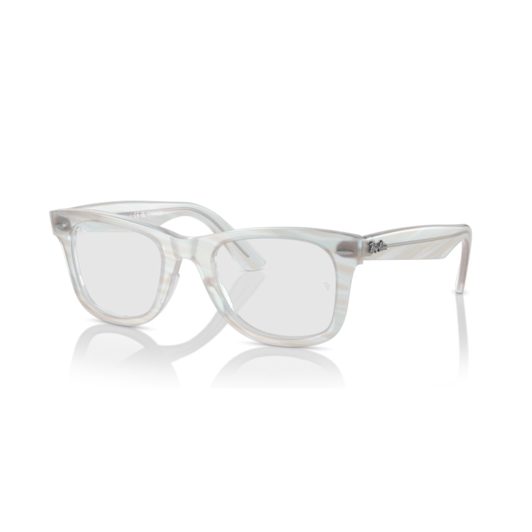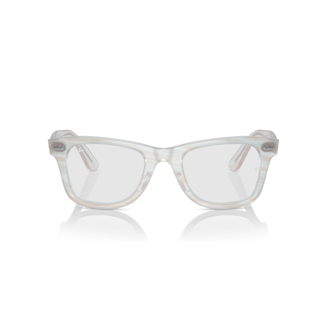 Un diseño innovador y llamativo, elaborado en acetato azul claro con sutiles rayas que aportan un estilo fresco y moderno. Su característica especial es la tecnología photochromic, que permite a la montura cambiar de color con la exposición al sol, ofreciendo un look dinámico y único.